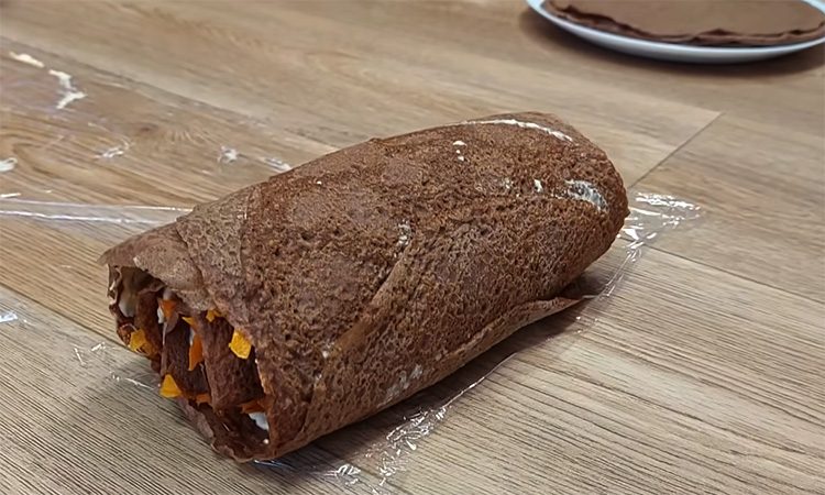 На пленку выложите блины внахлест, смажьте каждый майонезом, распределите овощную начинку ровным слоем. Аккуратно сверните рулет, заверните в пленку и уберите в холодильник на 3–4 часа для стабилизации.