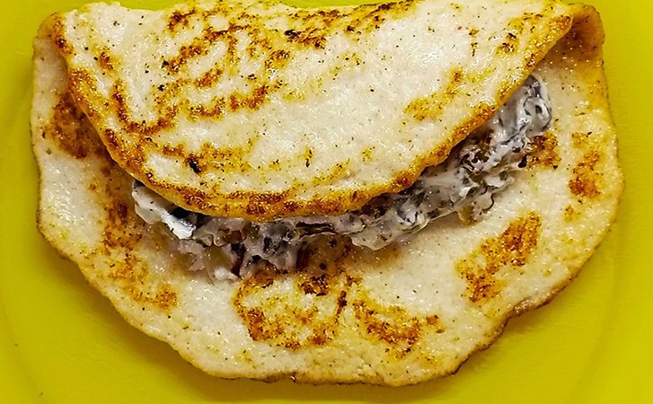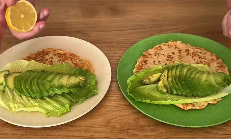 Выложите готовый блин на рабочую поверхность, распределите по нему листья салата, разложите авокадо, добавьте немного сока лимона для свежести и, если нужно, положите греческий йогурт или другие овощи. Сверните блин в рулет или подайте в развернутом виде, сохраняя начинку внутри.