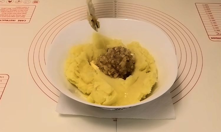 Накройте и оставьте тесто подойти, затем сделайте обминку лопаткой, снова накройте и дайте подойти еще раз. Сварите картофель до мягкости, разомните в пюре, добавьте сливочное масло и перемешайте. Поджарьте лук до мягкости и золотистого оттенка, соедините с картофелем и перемешайте. При желании добавьте укроп и охладите начинку. Смажьте рабочую поверхность маслом и выложите подошедшее тесто. Подкатайте его в вытянутый валик и разделите на кусочки по 50 г. Сформируйте шарики, смажьте их маслом и оставьте на десять минут.