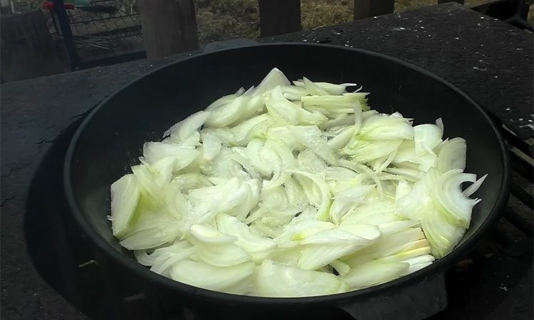 Лук нарежьте соломкой или полукольцами и выложите в холодную сковороду. Добавьте растительное масло, немного соли и готовьте на минимальном огне, пока лук не станет мягким и кремовым. Он должен томиться, а не жариться, поэтому следить за ним нужно постоянно.