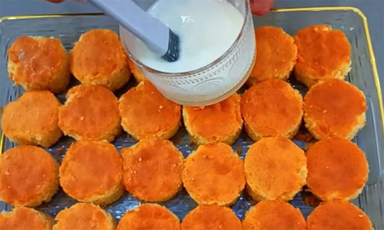 Выпекайте примерно 25–27 минут, затем полностью остудите корж и аккуратно снимите пергамент. Вырежьте из коржа кружочки диаметром около 6 см, а оставшиеся обрезки измельчите в крошку для обсыпки. Для пропитки смешайте теплое молоко с сахаром и размешайте до растворения. Каждую заготовку пропитайте молоком с обеих сторон, чтобы коржи стали мягче, но не потеряли форму.