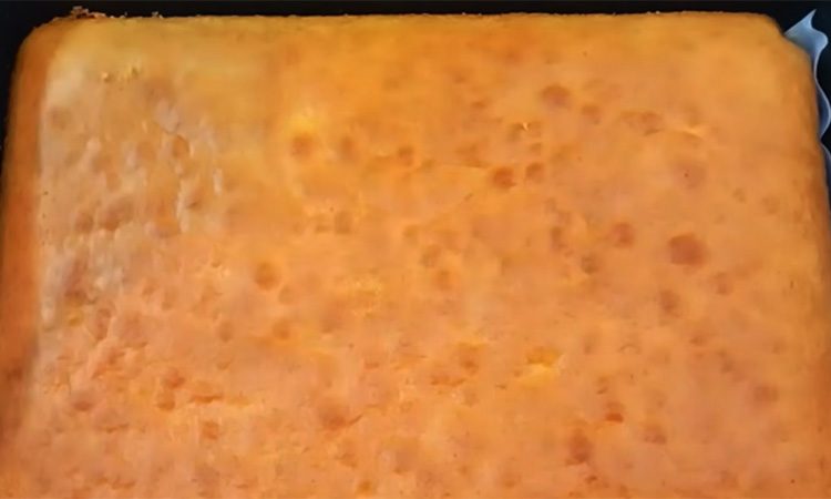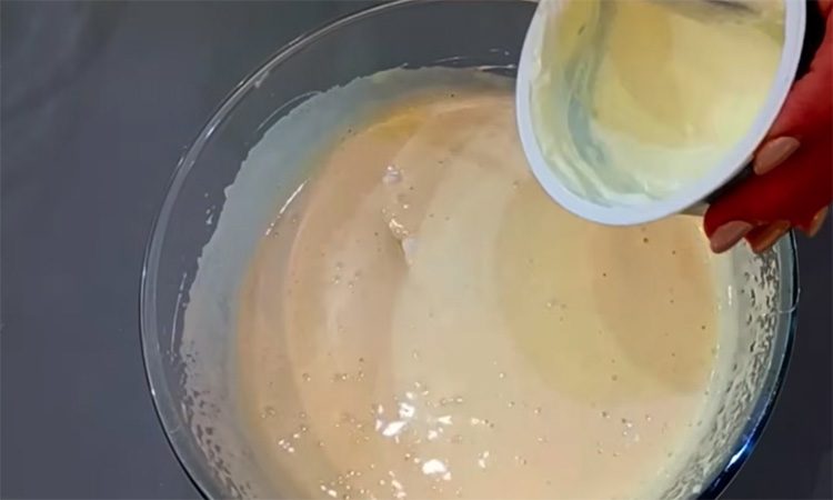 Снимите кастрюлю с огня, добавьте сливочное масло и ванилин, перемешайте до полного растворения, переложите в миску и накройте пленкой в контакт, оставьте остывать. Подготовьте тесто: взбейте яйца с щепоткой соли, постепенно всыпая сахар, пока масса не станет пышной. Добавьте сметану, растопленное масло и ванилин, перемешайте. Введите муку и разрыхлитель, доведите смесь до однородного теста. Перелейте его на противень, застеленный пергаментом, разровняйте поверхность и поставьте в духовку, разогретую до 180 градусов.