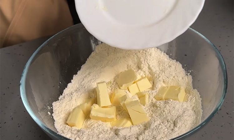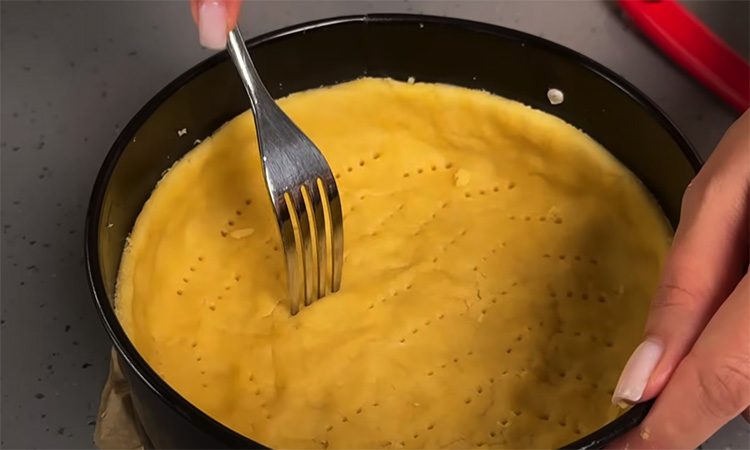 Для основы смешайте муку, соль и разрыхлитель до равномерного распределения. Холодное сливочное масло нарежьте кубиками и быстро разотрите с мукой до состояния крошки, важно не разогревать масло руками. Яйцо отдельно слегка взболтайте вилкой и добавьте к крошке, затем быстро соберите массу в однородный комок, не вымешивая долго. Тесто слегка подкатайте, переложите в форму диаметром около 18 см и распределите руками по дну и стенкам, формируя бортики.