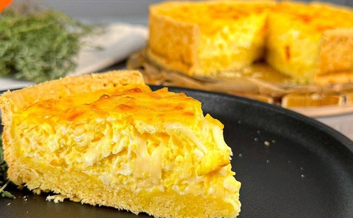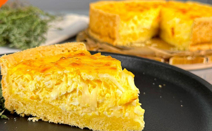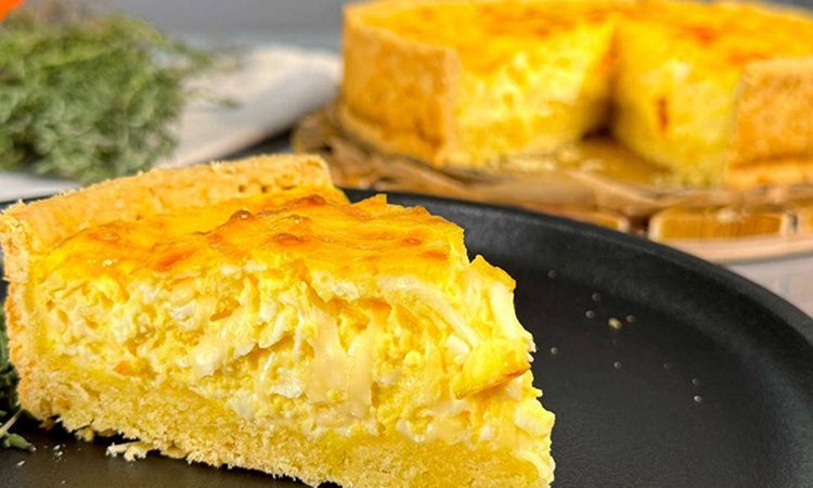 Пирог получается с рассыпчатым основанием и нежной сырной серединой.