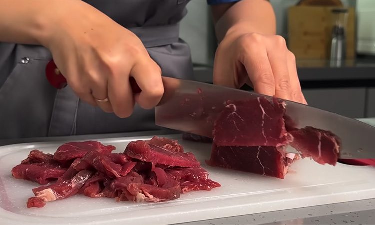 Тонко нарежьте слегка подмороженную говядину поперек волокон и положите в миску. Взболтайте яйцо, добавьте к мясу вместе с соевым соусом, небольшим количеством растительного масла и крахмалом, перемешайте и оставьте мариноваться.