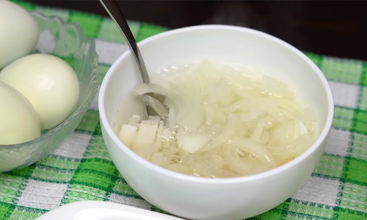 Сначала подготовьте яйца. Выложите их в кастрюлю, залейте холодной водой, доведите до кипения и варите после закипания около 9–10 минут до состояния вкрутую. Затем переложите яйца в холодную воду и полностью остудите, чтобы их было легче чистить и чтобы желток оставался ровным. Параллельно займитесь луком. Небольшую красную луковицу очистите и нарежьте мелкими кубиками, чтобы в салате не попадались крупные резкие куски. Переложите лук в пиалу, добавьте щепотку соли и щепотку сахара, влейте уксус и холодную воду.
