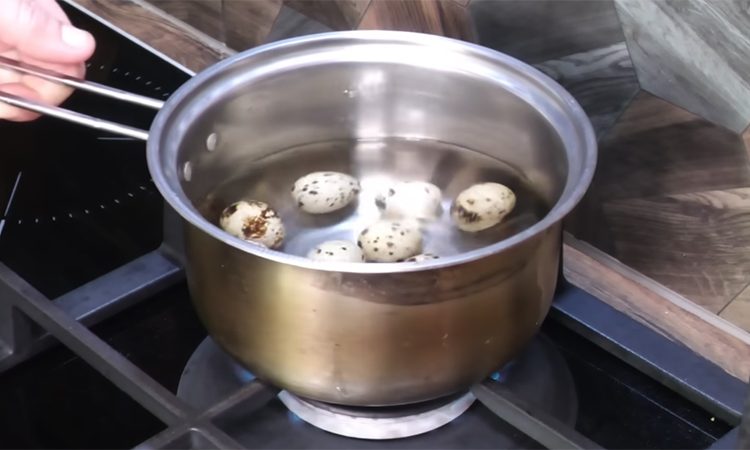 Сначала отварите куриную грудку и яйца. Грудку залейте горячей водой, доведите до кипения и варите на небольшом огне 5–8 минут, затем снимите с плиты и оставьте остывать прямо в бульоне, чтобы мясо осталось сочным. Куриные яйца залейте горячей водой, после закипания варите 7–8 минут, затем остудите в холодной воде. Перепелиные яйца залейте холодной водой, доведите до кипения, поварите около трех минут и также полностью остудите.