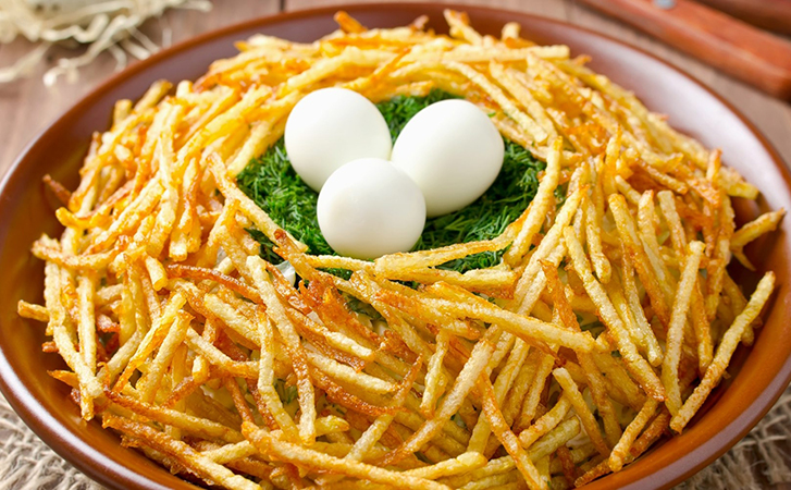Новогодняя версия салата «Гнездо Глухаря» позволяет сразу подать гостю аккуратную, готовую индивидуальную порцию с хрустящей основой из картофеля пай и мягкой начинкой. Картофельная корзинка служит не только украшением, но и полноценной частью вкуса, поддерживая сам салат с курицей и огурцом. Перепелиные яйца в центре визуально собирают композицию и подчеркивают тему гнезда. Нежный салат легко вписывается и в новогоднее меню, и в любое застолье, где важна яркая подача.