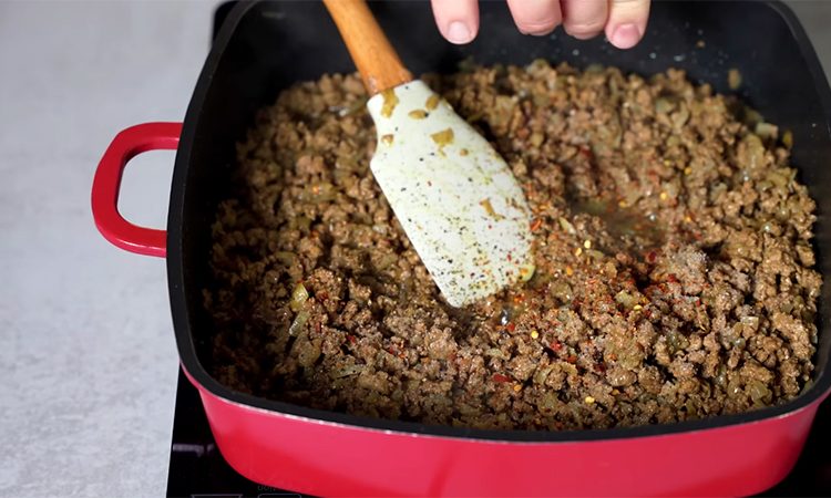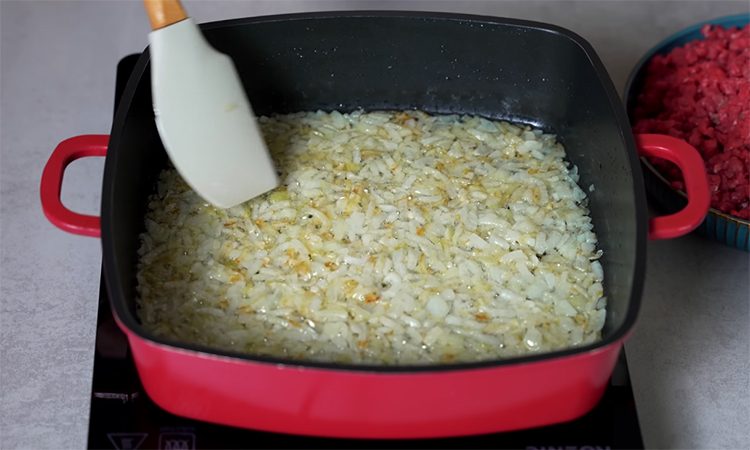 Подготовьте овощи, нарезав репчатый лук довольно мелко, но не до кашицеобразного состояния, и измельчив свежую зелень с чесноком. В глубокую сковороду с высокими бортиками налейте достаточное количество растительного масла и обжарьте лук до тех пор, пока он не начнет карамелизоваться и приобретать золотистый оттенок. К обжаренному луку добавьте говяжий фарш и сразу тщательно перемешайте, чтобы масло обволакивало мясные частицы, предотвращая их слипание в крупные комки.