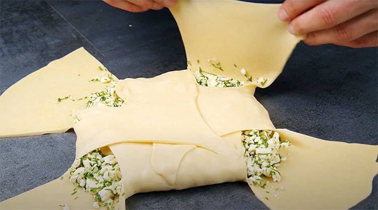 Разделите тесто на две части и раскатайте каждую в тонкую лепешку. Выложите на середину подготовленную начинку и аккуратно защипните края, формируя плацинд по вашему вкусу.
