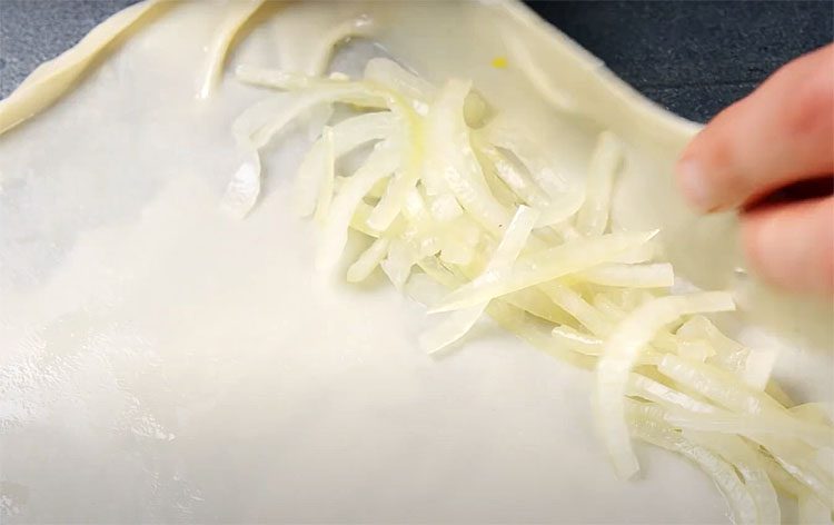 Лук нарежьте тонкими полукольцами, немного посолите и аккуратно разомните руками, чтобы он дал сок, но не стал кашей. Это придаст лепешкам мягкость и аромат. Выложите подготовленный лук на пласт теста, сверните его в длинную трубочку, затем улиткой и слегка приплюсните, формируя лепешку.