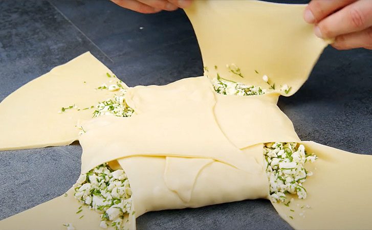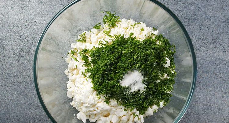 Для начинки соедините творог с мелко нарезанным укропом, добавьте соль, перец и яйцо. Перемешайте до однородной массы. Начинка должна быть плотной, но не сухой, чтобы удобно было выкладывать на тесто.