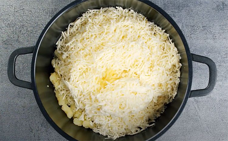 Приготовьте начинку: смешайте теплое картофельное пюре с натертым сыром сулугуни и измельченным чесноком. Начинка должна быть густой и легко формироваться.