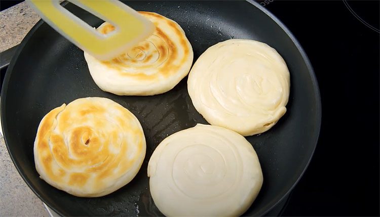 Каждый шарик теста раскатайте в лепешку, выложите в центр начинку и защипните края так, чтобы получился аккуратный мешочек. Затем осторожно раскатайте лепешку до размера сковороды, сохраняя равномерную толщину.