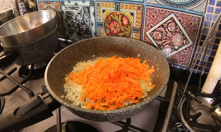 Очистите лук, нарежьте его мелко и сразу отправьте на сковороду с прогретым растительным маслом, чтобы он начал размягчаться. Когда лук станет прозрачным, добавьте натертую морковь, уменьшите нагрев и дайте овощам дойти до мягкого состояния, чтобы смесь стала однородной и без резких ароматов. В конце приправьте солью, перцем и небольшим количеством лимонного сока, перемешайте и оставьте остывать, так как горячие слои нарушат структуру салата.