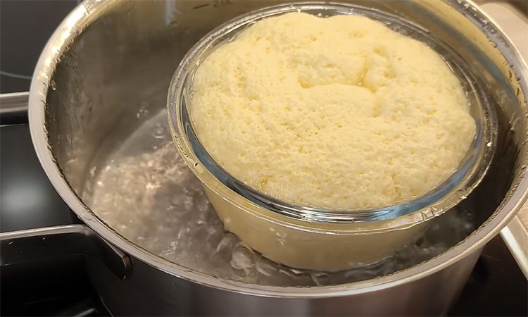 4. В широкую кастрюлю налейте воду, чтобы она доходила до середины миски с омлетом, и доведите до легкого кипения. Поставьте миску с омлетной смесью в кастрюлю. Накройте крышкой и варите 10–15 минут с момента повторного закипания.