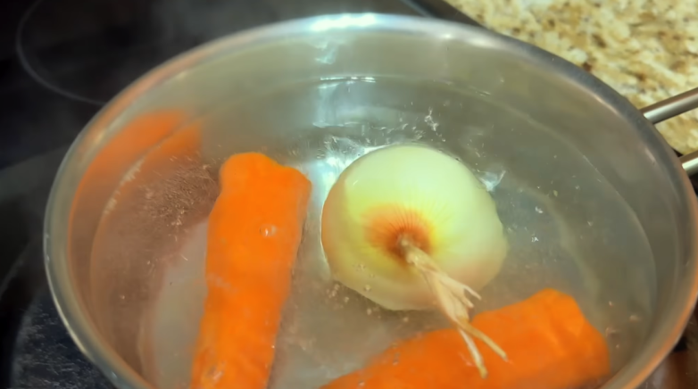Крышку можно положить с небольшим сдвигом и так, чтобы конденсат стекал не обратно в кастрюлю, а в отдельную миску. Когда холодец варится уже около 6 часов, можно добавлять ароматические компоненты. Лук очистите и разрежьте пополам или на крупные части, морковь также разрежьте вдоль. На сухой раскаленной сковороде или с помощью газовой горелки подпалите срезы лука и моркови до темных подпалин. Такая обработка даст бульону более яркий цвет и насыщенный вкус. В кастрюлю добавьте лавровый лист, перец горошком, затем отправьте подпаленные лук и морковь. Продолжайте варить еще 40–60 минут, пока мясо полностью не размягчится и не начнет легко отходить от костей.