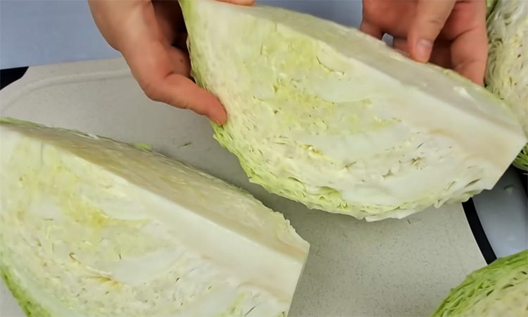 Разрежьте белокочанную капусту на четвертинки, а если кочан очень крупный, разделите на восемь частей. Оставьте на каждом кусочке небольшой фрагмент кочерыжки, он удержит листья и поможет сохранить форму при укладке в банку. Приготовьте солевой раствор: налейте в большую емкость 4 литра воды, добавьте соль из расчета 2 столовые ложки на 1 литр и размешайте до растворения. Отправьте капусту в рассол, сверху положите тарелку и установите небольшой груз, чтобы капуста была полностью погружена, затем оставьте на 2 часа, чтобы листья просолились и стали мягче. Достаньте капусту, промойте холодной проточной водой и оставьте стекать, чтобы лишняя соль ушла, а рассол не стал слишком соленым.