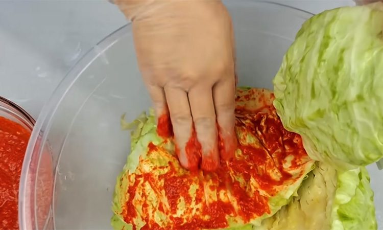 Возьмите немного перцовой приправы и обмажьте лист капусты, затем отделите несколько листьев, снова нанесите приправу и продолжайте, регулируя остроту по своему вкусу. Обмазанную четвертинку уложите в 3 литровую банку, утрамбуйте, а если кусок не проходит в горлышко, отделите часть середины и уложите плотнее, чтобы не ломать листья. Сформируйте рассол для банки из воды и небольшого количества перцовой приправы и добавьте его ровно настолько, чтобы капуста была увлажнена и пошла ферментация, но не заливайте до самого верха, оставьте свободное место для брожения.
