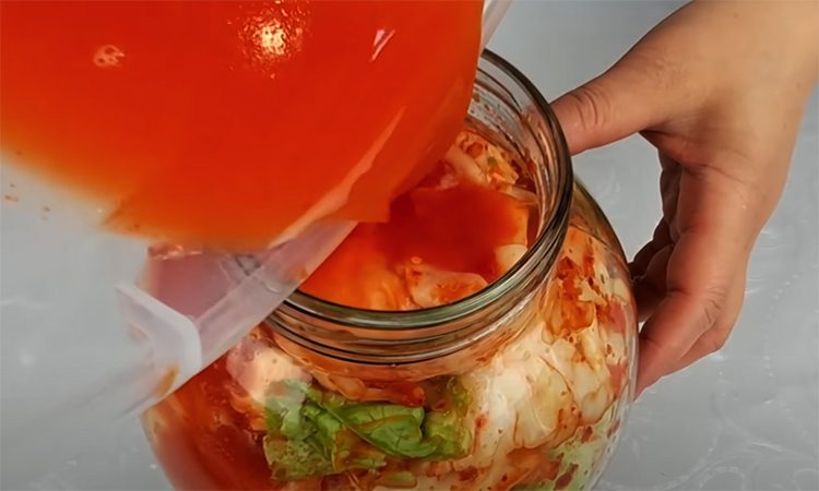 Закройте банку капроновой крышкой и оставьте при комнатной температуре на 1 сутки, если в помещении тепло. Если прохладно, выдержите 2 суток, затем отправьте готовое чимчи в холодильник для хранения и созревания. Поставьте под банку глубокую тарелку, потому что при брожении выделяется углекислый газ, рассол поднимается и может переливаться через край.