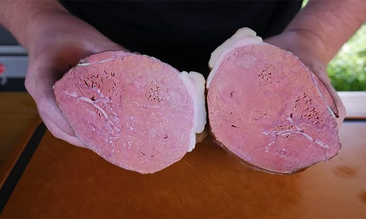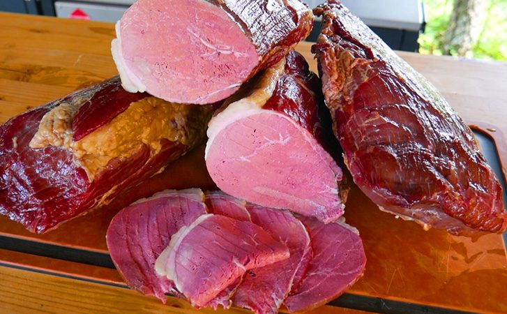 Залейте воду в парогенератор, закройте приток и вытяжку и оставьте температуру в камере около 85 градусов. Доведите температуру в центре самого толстого куска до 68 градусов, на это может уйти от 40 минут до нескольких часов в зависимости от размера мяса. Готовую говядину полностью остудите, дайте ей проветриться, затем уберите в холодильник минимум на сутки для стабилизации структуры.