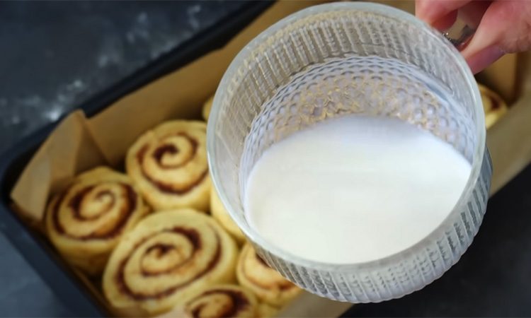 Поставьте противень в духовку на двадцать пять-тридцать минут, ориентируясь по румяности поверхности. Пока булочки выпекаются, смешайте творожный сыр, молоко и сахарную пудру, доведите смесь до гладкой текстуры. Достаньте горячие булочки и сразу покройте их кремом, дайте крему впитаться и оставьте выпечку остывать, чтобы структура окончательно стабилизировалась.