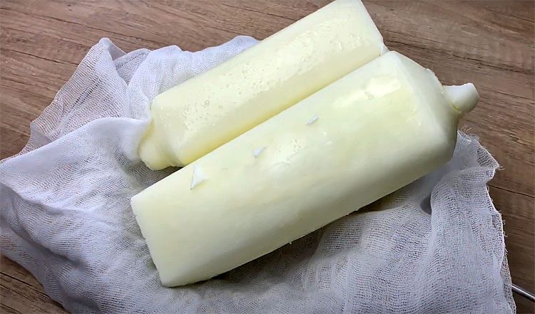 1. Заранее налейте кефир в подходящую форму или пакет для заморозки. Замораживание лучше проводить в морозильной камере на 8–12 часов, пока кефир не превратится в плотные бруски. Замороженный кефир легче отжимать, и он быстрее превращается в плотную массу при размораживании.