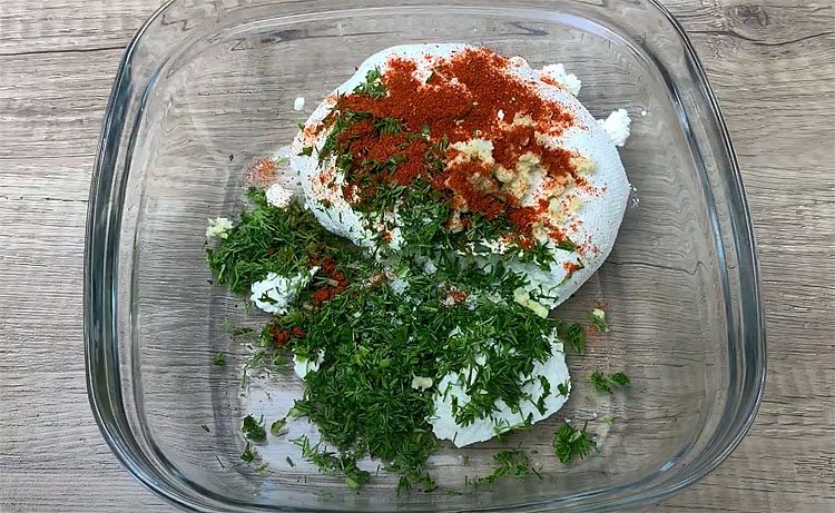 5. Переложите отжатую массу в миску или тарелку. Добавьте укроп, чеснок, копченую паприку и соль по вкусу. Тщательно перемешайте, чтобы все ингредиенты распределились равномерно, а сыр приобрел однородную кремовую текстуру.