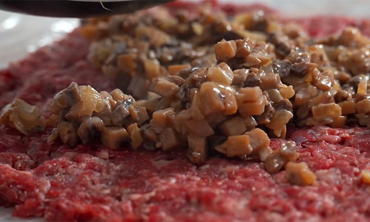 Говядину пропустите через мясорубку вместе с одной луковицей, добавьте манную крупу, соль и черный перец, тщательно вымесите фарш до однородности и оставьте на 10–15 минут, чтобы манка набухла и связала массу. Шампиньоны нарежьте мелкими кубиками, разогрейте сковороду с небольшим количеством растительного масла и обжарьте грибы на сильном огне до полного испарения влаги, затем добавьте мелко нарезанный лук и сливочное масло, обжаривайте еще 5–7 минут до мягкости.