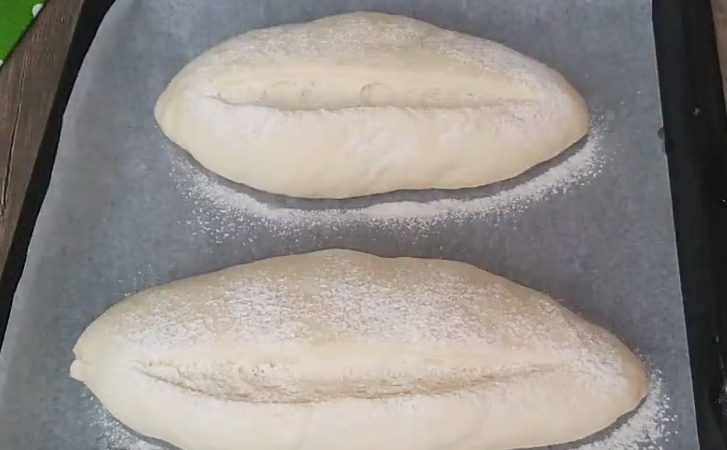4. Выложите тесто на слегка присыпанную мукой рабочую поверхность. Разделите его на равные части (количество зависит от желаемого размера багетов). Сформируйте каждый кусок в продолговатую форму багета. Сверху сделайте неглубокий надрез ножом или лезвием — это позволяет хлебу «дышать» при выпечке и красиво раскрывается корочка.