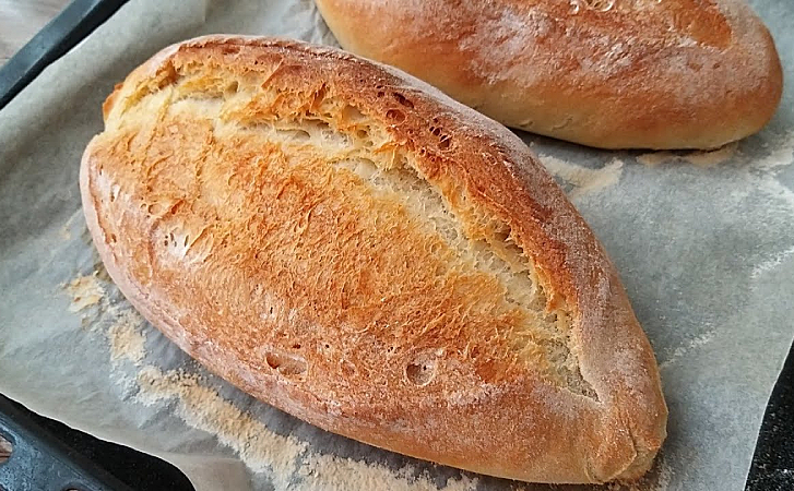5. Разогрейте духовку до 200 °C. Переложите багеты на противень, можно застелить его пергаментной бумагой. Выпекайте 40 минут до золотистой корочки. Если хотите более хрустящую корочку, за 5 минут до конца можно слегка сбрызнуть багеты водой или поставить мисочку с водой в духовку.