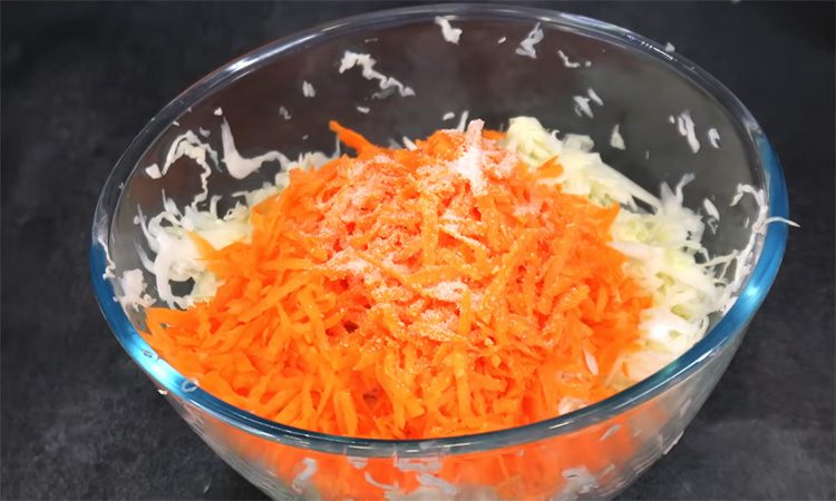 Снимите с огня, добавьте натертую морковь и сахар, перемешайте до равномерного вкуса. Переложите салат в банку или контейнер, закройте и отправьте в холодильник на 1–2 часа, за это время вкус соберется, а хруст станет ярче. Перед подачей полейте растительным маслом и еще раз перемешайте, чтобы масло раскрыло аромат овощей.