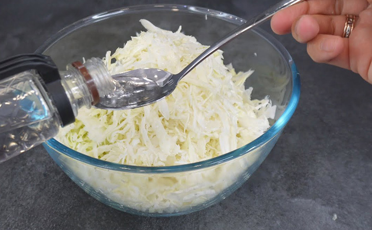 Нашинкуйте капусту и переложите в большую миску, затем добавьте соль и тщательно перемешайте руками, чтобы капуста стала чуть мягче, но не потеряла упругость. Влейте уксус, снова перемешайте и переложите капусту в глубокую сковороду или сотейник. Поставьте на минимальный огонь и прогрейте, следя за температурой: капуста должна стать лишь слегка теплой, не горячей.
