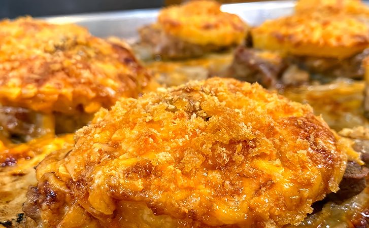 Мясо по-французски хорошо держит форму, остается сочным внутри и дает аккуратный разрез с выраженными слоями и насыщенным вкусом.