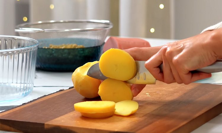 Нарежьте картофель пластинками толщиной около 0,5 см, затем нарежьте кубиками и переложите в кастрюлю, залейте холодной водой, доведите до кипения и варите около 7 минут после закипания до готовности, затем откиньте на дуршлаг и полностью остудите, чтобы кубики не размялись при сборке. В ту же кастрюлю переложите нарезанную кубиком морковь, залейте холодной водой, доведите до кипения и варите до полной готовности, затем откиньте на дуршлаг и также остудите.