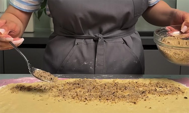 Пересыпьте орехи в миску, добавьте сахар и перемешайте начинку. Достаньте тесто из холодильника, рабочую поверхность обильно присыпьте мукой. Раскатайте тесто в прямоугольник толщиной около 3–4 мм. Равномерно распределите ореховую начинку, оставив небольшой отступ с одного края. Слегка прокатайте начинку скалкой и аккуратно сверните тесто в плотный рулет.