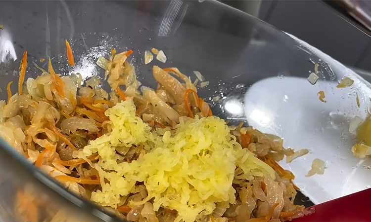 Квашеную капусту промойте, тщательно отожмите от лишней влаги и отправьте на ту же сковороду к луку, чтобы слегка подтушить ее до мягкости в течение нескольких минут. Остывший картофель очистите от кожуры и натрите на мелкой терке либо пропустите через мясорубку для получения однородной массы.