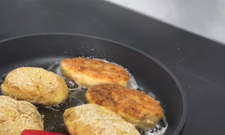 Сформируйте небольшие котлеты влажными руками, обмакните каждую сначала во взбитое яйцо, а затем обильно обваляйте в панировочных сухарях со всех сторон. Обжаривайте заготовки на разогретой сковороде с растительным маслом на умеренном огне до появления выраженной румяной корочки с обеих сторон.