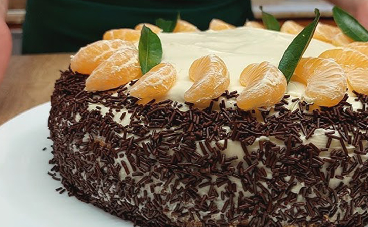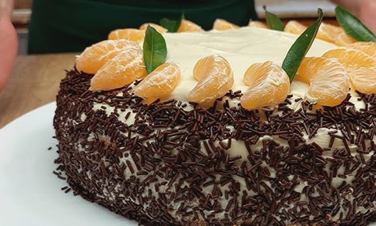 Остывший корж разрежьте на три части, соберите торт, промазывая слои кремом, накройте и уберите в холодильник на несколько часов, после чего оформите верх и бока по желанию дольками мандаринов.