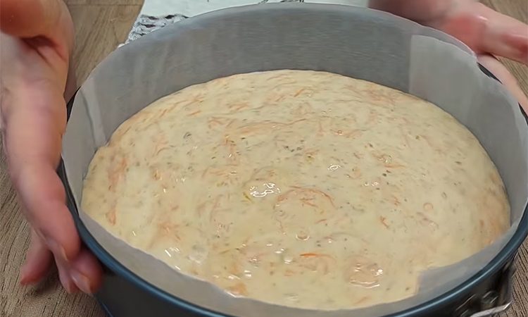 Яйца разбейте в глубокую миску, добавьте соль и сахар, взбейте до пышной светлой массы, затем на минимальной скорости вмешайте кефирную смесь. Муку вводите порциями, аккуратно перемешивая до однородности, после чего добавьте морковь с орехами и вмешайте лопаткой движениями снизу вверх. Тесто переложите в форму диаметром около 24 см, разровняйте, слегка встряхните и отправьте в разогретую до 170 градусов духовку на 40–50 минут, через 25–30 минут накройте верх фольгой.
