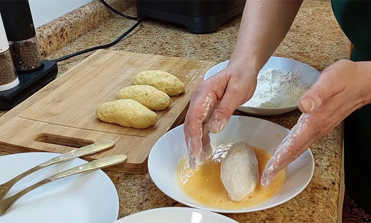 Смочите руки водой, возьмите порцию фарша, вложите кусочек масла внутрь и сформируйте котлету, полностью закрывая начинку. Подготовьте панировку: в одну тарелку разбейте яйцо и взбейте, во вторую насыпьте муку, в третью сухари. Обваляйте котлеты сначала в муке, затем в яйце и после этого в сухарях, слегка прижимая панировку. Для жарки разогрейте сковороду с достаточным количеством растительного масла.