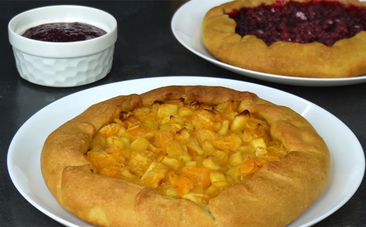 Обомните тесто, разделите его на две части и раскатайте каждый кусок сразу на пергаменте, формируя круглые пласты. Выложите первую начинку в центр, оставьте свободные края и заверните их внутрь, легко прижимая, чтобы они закрепились. Повторите то же с брусничной начинкой, сформируйте вторую галету и перенесите их на противень. Выпекайте при 180 градусах тридцать пять-сорок минут.