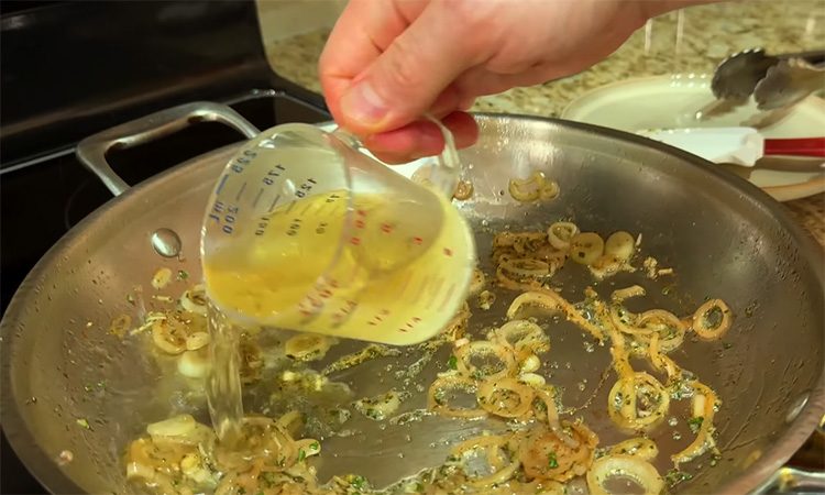 Подрумяненную курицу снимите и накройте, чтобы она не остывала. На той же сковороде в оставшемся жире лук прогрейте до мягкости, затем чеснок добавьте, тимьян, розмарин и лавровый лист положите, дайте специям раскрыться в горячем масле. Если используете вино, вино влейте и упарьте примерно наполовину, затем введите щепотку мускатного ореха.