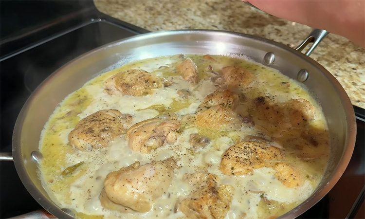Грибы и курицу обратно в сковороду верните, жидкость отрегулируйте так, чтобы мясо было погружено наполовину. Нагрев уменьшите до минимума, крышкой накройте и томите около 35 минут до мягкости курицы.
