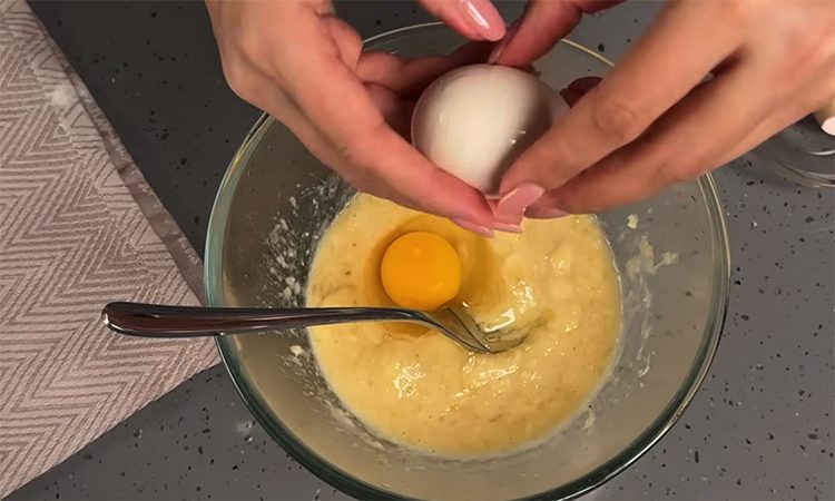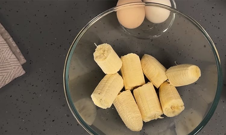 Бананы очистите от кожуры, выложите в глубокую миску и разомните толкушкой для картофеля или вилкой до состояния однородного пюре. В полученную массу вбейте яйца, добавьте щепотку соли и тщательно перемешайте все до объединения компонентов. Муку заранее соедините с разрыхлителем и постепенно всыпьте в банановую смесь, аккуратно размешивая, чтобы в тесте не осталось сухих комочков.