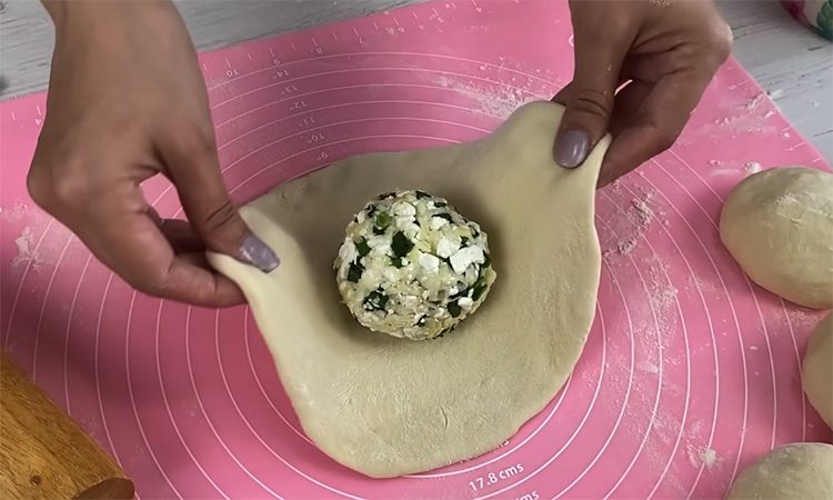 Каждый кусочек теста немного раскатайте или растяните руками, положите в центр шар начинки и соберите края к середине, как мешочек. Плотно защипните верхушку, переверните швом вниз и аккуратно раскатайте скалкой в тонкий блин толщиной около пяти миллиметров.