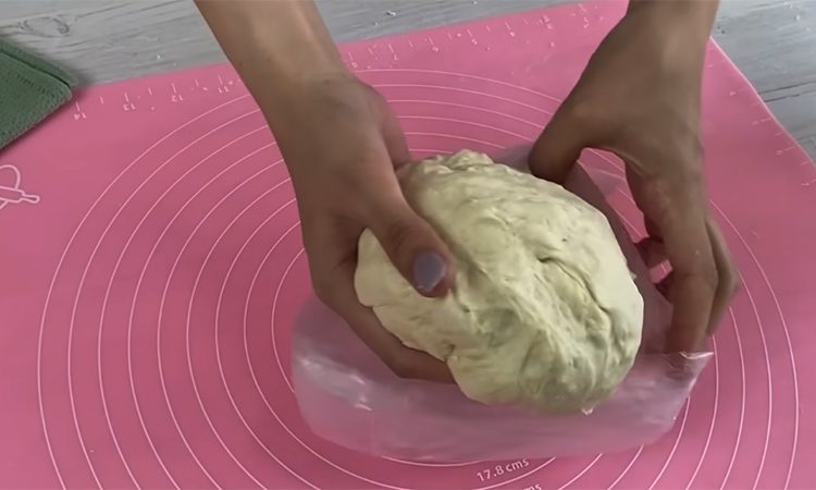 В миску вылейте теплый кефир, добавьте в него соль и соду, затем хорошо перемешайте, чтобы пошли пузырьки. Понемногу всыпайте муку и замешивайте тесто сначала ложкой, а потом переходите на стол. Тесто должно получиться очень мягким и немного липким, поэтому не добавляйте слишком много муки, лучше смажьте руки маслом. Положите его в пакет на тридцать минут, чтобы оно отдохнуло и стало послушным.