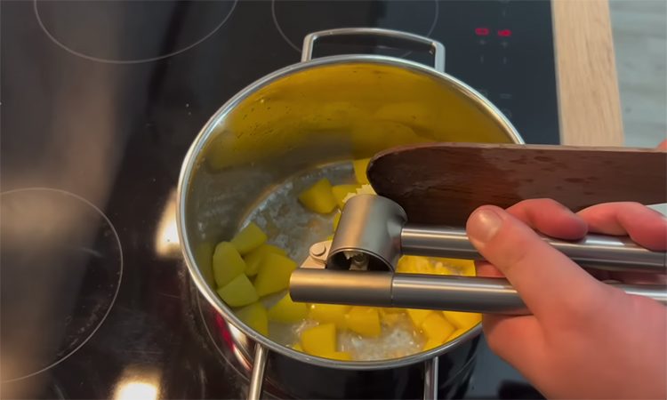 В оставшийся кипящий бульон отправьте двадцать пять зубчиков чеснока, нарезанных тонкими пластинками, чтобы они отдали свой аромат основе супа. Соедините обжаренный картофель с луком и чесночный бульон в кастрюле, после чего варите суп до полной мягкости картофеля.
