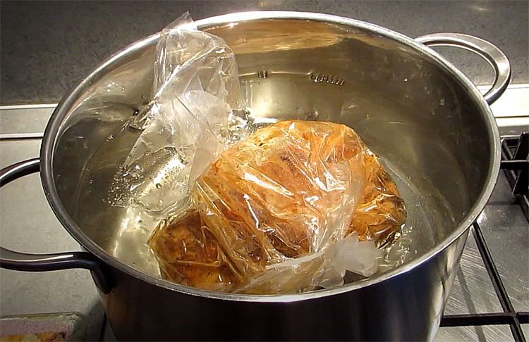 4. В удобной кастрюле вскипятите достаточное количество воды, чтобы пакет с мясом был полностью покрыт. Опустите мясо в пакете в кипящую воду, уменьшите огонь до умеренного кипения и накройте кастрюлю крышкой. Готовьте мясо около полутора часов, поддерживая слабое, равномерное кипение. Вода не должна бурлить слишком активно — это позволит сохранить сочность и мягкость буженины.