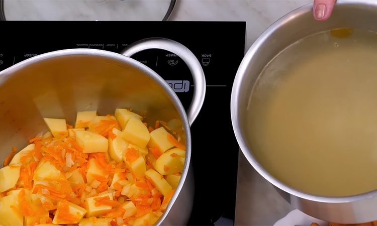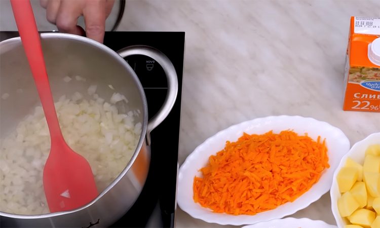 На сковороде с растительным маслом обжарьте вторую мелко нарезанную луковицу до прозрачности, затем добавьте кубики моркови и кусочек сливочного масла. Томите овощи на медленном огне пару минут, не доводя до полной готовности, и переложите их в кастрюлю к картофелю. Отваренные ранее целые картофелины разомните вилкой в пюре и верните в суп для придания густоты.